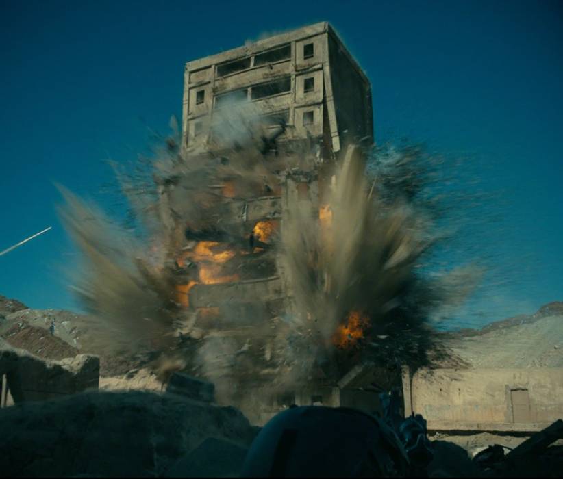 یکی را از بالا منفجر کردیم و دیگری را از پایین. زاویهی دوربین را طوری تنطیم کردیم که بتوانیم آنها را به هم وصل کنیم. یک ترکیب از دو انفجار مینیاتوری جداگانه. این سکانس مثال خوبی از یکپارچگی کامل جلوههای ویژه بصری، جلوههای ویژهی میدانی و تیم هنری است که همه با هم کار میکردند تا به نتیجهی راضی کنندهای برسند. این احتمالا بزرگترین همکاری جلوههای ویژه بصری و میدانی در یک فیلم بوده است.»