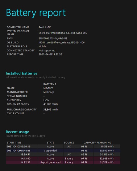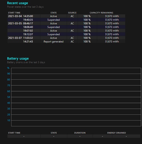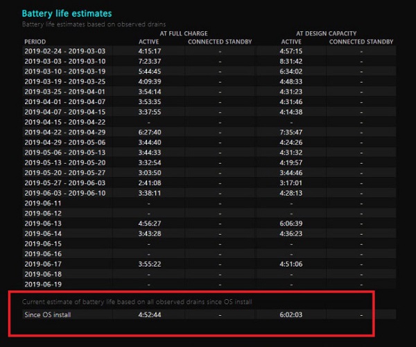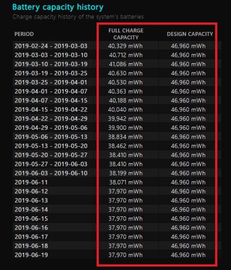 در بخش Battery capacity history میتوانید تغییرات باتری را در گذر زمان در مقایسه با Design Capacity و Full Charge Capacity مشاهده کنید.