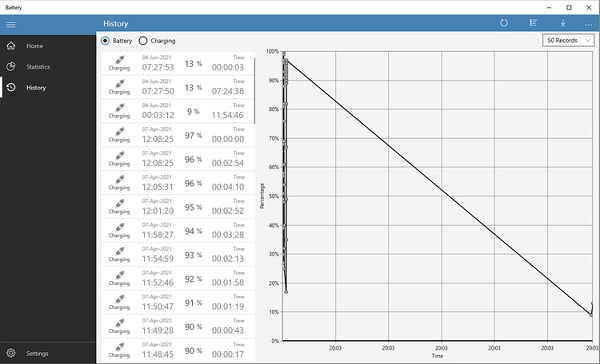امکان تغییر تم برنامه هم وجود دارد. با این برنامه میتوانید برای شارژ کامل، باتری کم و… اعلان بگذارید. با کلیک روی سربرگ History میتوانید نمودار استفاده از باتری را مشاهده کنید. علاوه بر این، میتوانید این لیست را ذخیره کنید. نکته مهم این است که این برنامه تا ۳۰ روز اطلاعات را نگه میدارد. در نتیجه، اگر میخواهید اطلاعات باتری را ذخیره کنید، باید حواستان به این زمانبندی باشد.