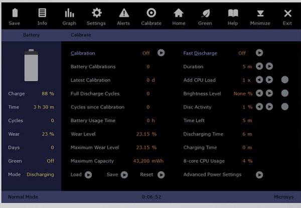 در صفحه Calibrate هم میتوانید اطلاعات آماری میزان فرسودگی باتری، زمان استفاده، چرخه تخلیه و… را مشاهده کنید. امکان ذخیره کردن تمامی این اطلاعات هم وجود دارد. با استفاده از Green mode میتوانید در مواقع ضروری در نگهداری شارژ صرفهجویی کنید. امکان گذاشتن اعلان برای کم شدن باتری و رفتن به حالت Standby یا Hibernate هم وجود دارد.