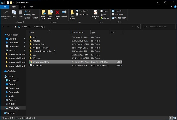 این دستور گزارشی از سلامت باتری شما را به صورت HTML ذخیره میکند. اصولا محل ذخیره به شیوه زیر است و در درایو C ذخیره میشود.