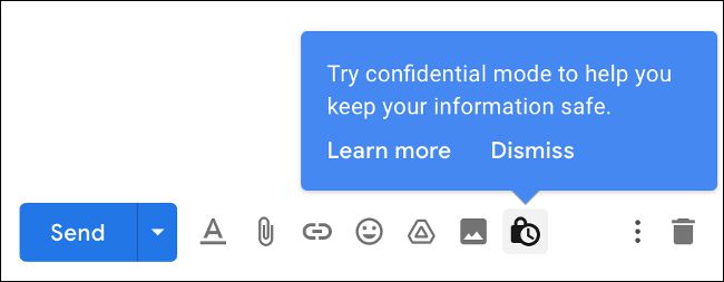 برای استفاده از حالت محرمانه وارد حساب جیمیل خود شوید و شروع به نوشتن یک ایمیل کنید. مخاطب و موضوع را وارد کرده، پیامتان را تایپ کنید و در نهایت روی گزینه حالت محرمانه در پایین صفحه (مشابه تصویر زیر) کلیک کنید. گزینه این حالت به صورت یک قفل به همراه تایمر طراحی شده است.