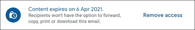 محتوای پیام شما در این ایمیل وجود ندارد و پیام تنها در سرورهای گوگل موجود است. در کنار فرایند تاییدیه، پیامی که توسط حالت محرمانه فرستاده میشود، پس از مدتی از بین میرود. شما میتوانید یک زمان برای نابودی آن درنظر بگیرید. شما میتوانید یک هفته، یک ماه، سه ماه یا پنج سال را به عنوان تاریخ منقضی شدن پیام انتخاب کنید.