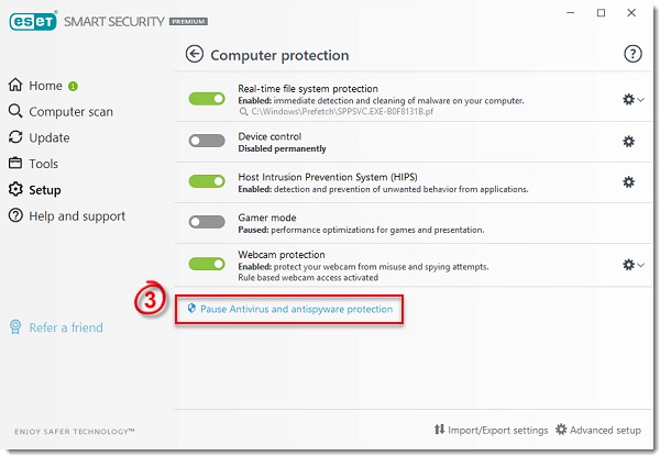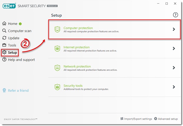 برای غیر فعال کردن آنتی ویروس Eset در ویندوز ۱۰ و.. ابتدا باید برنامه آنتی ویروس را باز کنید. در ادامه روی گزینه Setup بزنید. پس از آن از منو سمت راست گزینه Computer Protection را انتخاب نمایید.