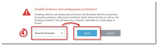 در صفحه جدید گزینه Pause Antivirus and antispyware protection را انتخاب کنید.