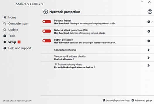 برای غیر فعال سازی آنتی ویروس Eset فایروال ابتدا وارد برنامه آنتی ویروس در رایانه شوید. سپس از منوی سمت چپ گزینه Setup را انتخاب کنید. در ادامه روی گزینه Network Protection بزنید.