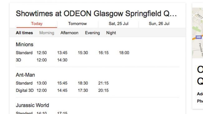 برای یافتن زمانبندی پخش فیلمها در سینما در یک منطقهی خاص باید عبارت "movie times" را جستوجو کنید. مثلا اگر عبارت "movie times London" را جستوجو کنید در قسمت بالایی نتایج نواری شامل فهرستی از فیلمهای درحال نمایش در سینماهای لندن نمایش داده خواهد شد. جستوجوی مشابه با نام شهرهای ایران، فهرست سینماهای موجود در سرویس نقشهی گوگل را نمایش میدهد.