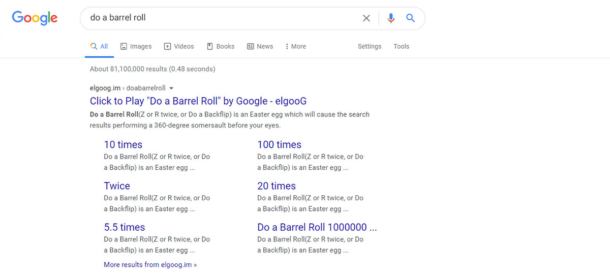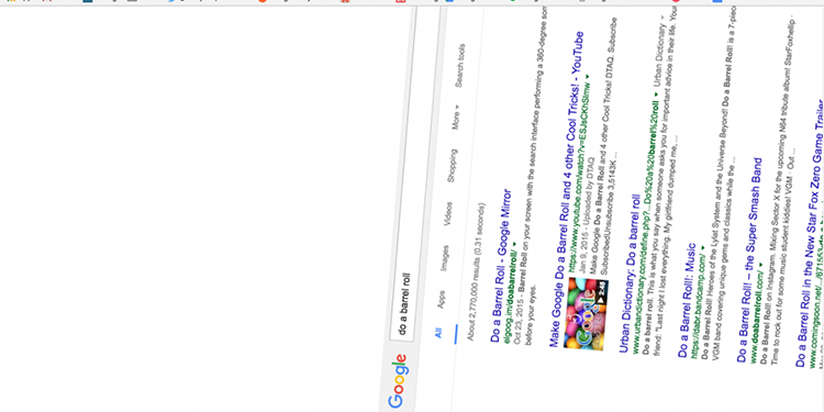 ۱۲- بازی Star Fox 64 یکی از بازیهای مشهور تاریخ است که چرخش، جزئی جالب از آن بود. جستوجوی عبارت "do a barrel roll"، صفحه جستوجو را مانند این بازی ۳۶۰ درجه میچرخاند. عبارت "z or r twice" نیز همین نتیجه را دارد. نکته جالب این است که برای انجام عمل چرخاندن در بازی مذکور، گیمر باید ترکیب دو بار دکمه z یا دکمه r در کنترلر نینتندو ۶۴ را اجرا میکرد.