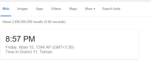 با گسترش تکنولوژی، شاهد وسیع شدن دامنهی جغرافیای روابط انسانها هستیم؛ حتما برای شما نیز اتفاق افتاده است که نیازمند دانستن زمان در یک شهر یا کشور خاص باشید. برای اطلاع از زمان در یک منطقهی خاص باید عبارتی مانند "time tehran" را جستوجو کنید. برای جستوجوی زمان در مناطق دیگر تنها باید بهجای "Tehran" نام شهر موردنظر خود را بنویسید. برای اطلاع از زمان غروب و طلوع خورشید عبارات "Sunset" و "Sunrise" را درکنار نام شهر موردنظر جستوجو کنید.
