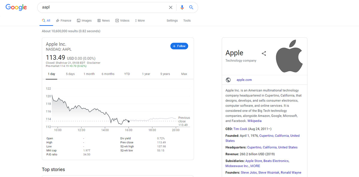 برای اطلاع از تغییرات ارزش سهام یک شرکت تنها باید شاخص مربوط به آن را جستوجو کنید؛ برای مثال جستوجوی AAPL اطلاعات سهام شرکت اپل و GOOG اطلاعات سهام گوگل را به شما میدهد. بسیاری از افراد ممکن است از این کدها اطلاع نداشته باشند. در این شرایط تنها باید عبارتی مانند "Panasonic stock Tokyo" را جستوجو کنید. این جستوجو به شما اطلاعات سهام شرکت پاناسونیک در بورس توکیو را خواهد داد.