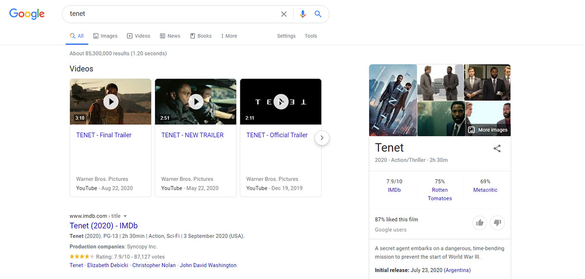 گوگل اطلاعات زیادی در مورد فیلمها دارد. برای مثال وقتی شما عبارت "Dark Knight" را جستوجو میکنید گوگل در قسمت سمت راست نتایج جستوجو اطلاعات کاملی در مورد کارگردان، بازیگران، زمان عرضه و خلاصهی داستان و چند نقد کوتاه در مورد این فیلم را نمایش خواهد داد. اگر فیلم موردنظر در حال اکران در سینما باشد نیز گوگل برای یافتن سینماها و ساعات نمایش آن به شما کمک خواهد کرد.