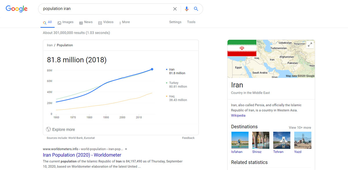 گوگل گنجینهای از اطلاعات گوناگون را ذخیره کرده است؛ به همین دلیل پاسخ بسیاری از سوالات شما را در خود دارد. برای مثال اگر بخواهید از جمعیت یک کشور مطلع شوید تنها باید عبارت "population" را همراهبا نام محل موردنظرتان جستوجو کنید. شاید گوگل تنها مرجع کسب اطلاعات نباشد، ولی قطعا یکی از سادهترین راهها برای کسب اطلاعات گوناگون را دراختیار شما قرار میدهد.