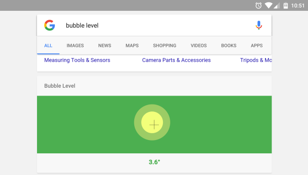 اگر با مرورگر گوشی خود عبارت bubble level را جستوجو کنید، در صورتی که گوشی مجهز به ژیروسکوپ باشد، یک تصویر سبز رنگ با یک حباب مانند تراز حبابی برای شما به نمایش در میآید.