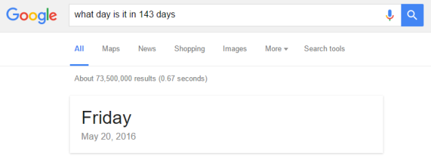 شاید کنجکاو باشید که ۱۰۰ روز دیگر، چه روزی از هفته است؟ بدون نیاز به تقویم یا نرمافزار اضافه، گوگل این محاسبه را برای شما انجام میدهد. تنها باید در نوار جستوجو عبارتی شبیه به این عبارت بنویسید: what day is it in 143 days