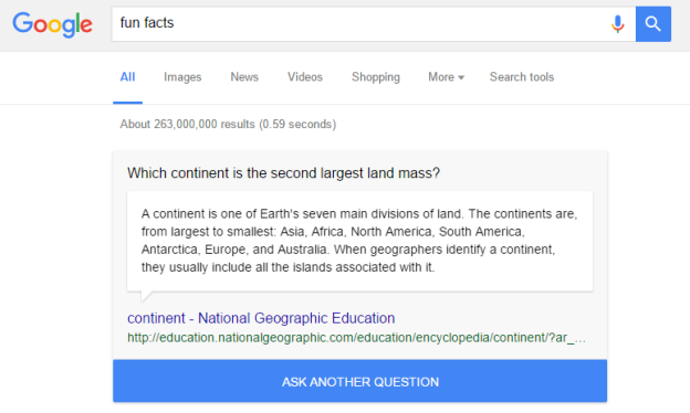 با نوشتن دو عبارت سادهی fun facts در نوار جستوجو، بهصورت تصادفی، عبارتی جذاب و جالب برای شما به نمایش در میآید.