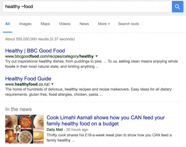اگر میخواهید وبسایتهایی را بیابید که در زمینه موردنظرتان فعالیت میکنند؛ تنها باید در جستوجوی خود از نشانه "~" استفاده کنید. برای مثال اگر جستوجوی شما به این حالت باشد "healthy ~food" در نتایج مشاهده خواهید کرد که محتوایی شامل تغذیه سالم و دستورالعملهای تهیه غذا به نمایش درآمده است.