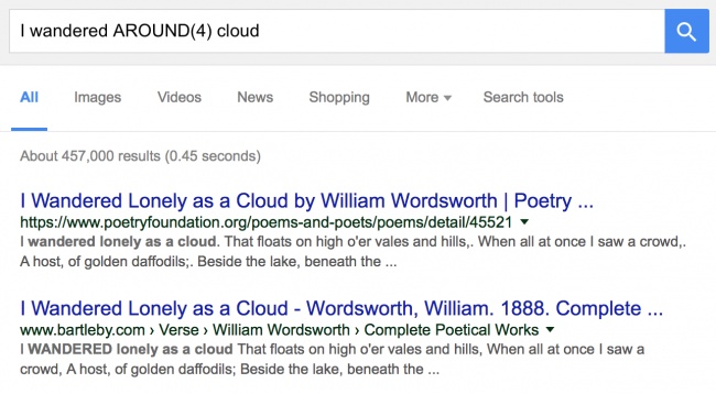 گاهی اوقات باید عبارتی طولانی را جستوجو کنید اما تعدادی از کلمات آن را از یاد بردهاید و تنها استفاده از یک واژه کلیدی نیز پاسخگو نیست. در چنین شرایطی تنها باید که ابتدا و انتهای عبارت را نوشته و سپس از عبارت ()AROUND استفاده کنید. سپس در داخل پرانتز تعداد کلماتی را که از عبارت حذف شدهاند، قرار دهید.
