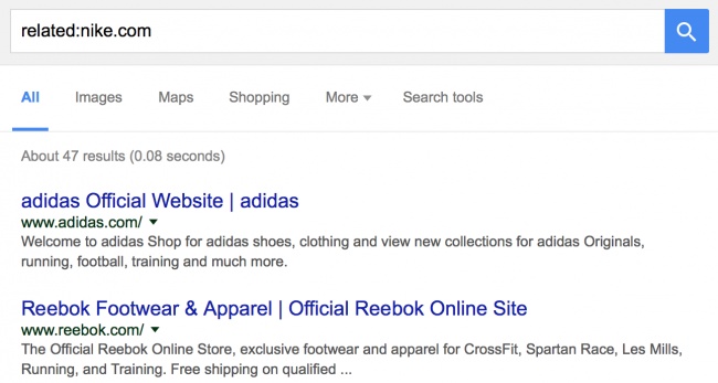فرض کنید موضوع جالبی در اینترنت یافتهاید و میخواهید وبسایتهایی را که محتوای مشابهی دارند بیابید. برای انجام این کار تنها باید که از عبارت ":related" استفاده کرده و سپس آدرس سایت مد نظر را وارد کنید. در نظر داشته باشید که میان عبارت و آدرس وبسایت مدنظرتان فاصله قرار ندهید.