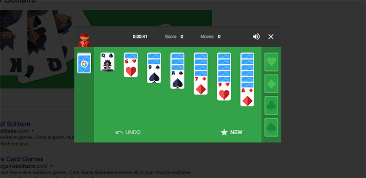 ۱- اگر عبارت "solitaire" را در گوگل جستوجو کنید، این وبسایت یک صفحه برای انجام این بازی معروف کارتی برای شما نمایش میدهد. این بازی نسخه استاندارد است و خبری از بازی Freecelll در آن نیست.