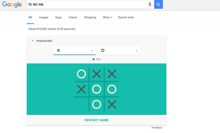 ۲- بازی مخفی دیگر در صفحه جستوجوی گوگل، بازی معروف ضربدر و دایره است که با جستوجوی عبارت "tic tac toe" برای کاربر به نمایش درمیآید. کاربر میتواند این بازی را بهصورت تکنفره یا دونفره بازی کند. درجه سختی Impossiblee این بازی، بزرگترین چالش آن و بسیار دشوار محسوب میشود.
