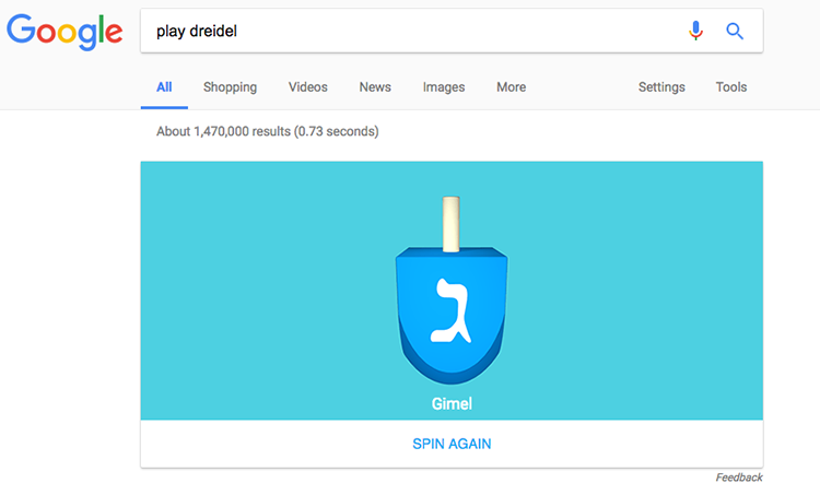 ۳- یک بازی مشهور غربی با نام dreidel در گوگل گنجانده شده است که با جستوجوی عبارت "spin dreidel" یا "play dreidel" اجرا میشود.