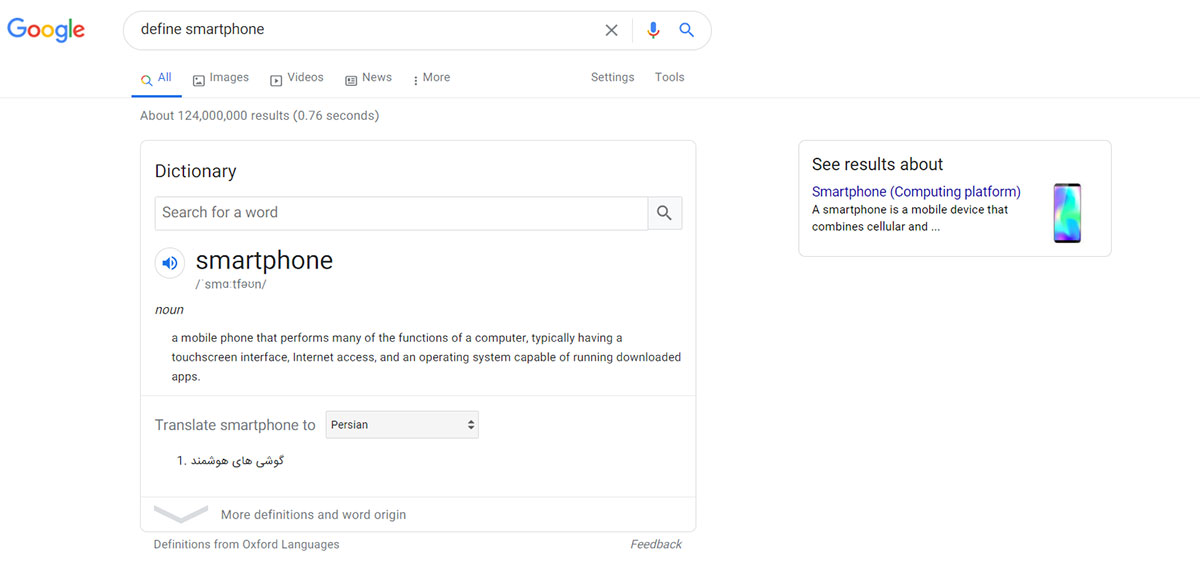 گوگل در حدس زدن منظور شما از عبارت جستوجو شده بسیار توانمند است؛ ولی میتوان بهکمک عبارتهای اضافه در جستوجو، به نتایج آن جهتدهی بهتری داد. برای اینکه معنی یک عبارت یا کلمه را بدانید عبارت موردنظر را همراهبا "define" جستوجو کنید. در این صورت، علاوهبر نمایش ترجمه مواردی مانند ریشه کلمات، معانی دیگر و گراف محبوبیت آن واژه نیز نمایش داده خواهد شد.