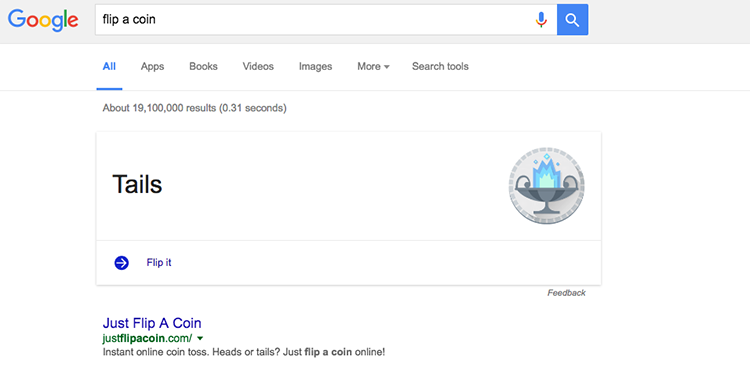 ۴- سکه انداختن و انتخاب بین دو گزینه، از قابلیتهای مخفی گوگل است که با عبارت "flip a coin" اجرا میشود.