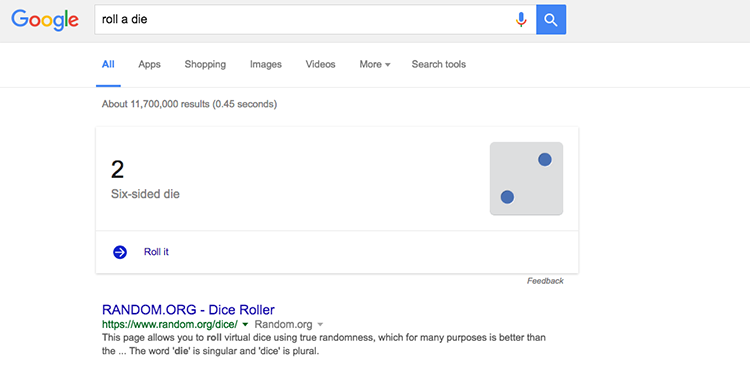 ۵- اگر بخواهید بین ۶ گزینه انتخاب داشته باشید یا تاس ریختن را امتحان کنید، گوگل قابلیتی برای شما تعبیه کرده است که با جستوجوی "roll a die" برای شما اجرا میشود و عددی بین ۱ تا ۶ را بهعنوان پاسخ نشان میدهد. در نسخههای جدید میتوانید تاسهای بیشتر را هم اضافه کنید که تا تاس ۲۰ وجهی پشتیبانی میشود.