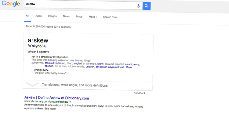 ۶- برخی قابلیتها صرفا جنبه تفریحی دارند. جستوجوی عبارت "askew"، صفحه جستوجو را تحت دستور askew تصویر قرار میدهد.