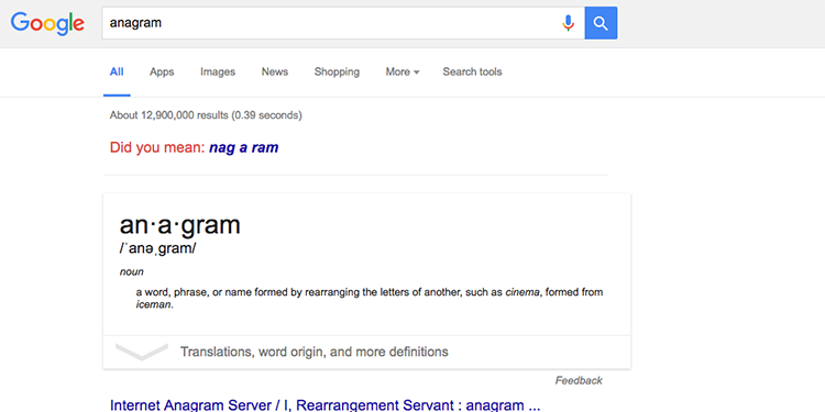 ۷- anagram بهمعنای کلمهای است که از تغییر مکان حروف کلمه دیگر ساخته شده باشد. اگر این عبارت را در گوگل جستوجو کنید، موتور جستوجو از شما میپرسد که آیا منظورتان کلمه nag a ram بوده است؟ این کلمهای است که از جابجایی حروف کلمه anagram ساخته میشود!