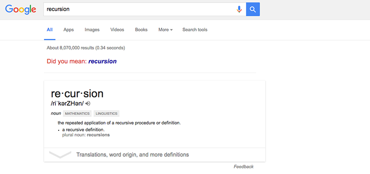 ۸- عبارت recursion، یک اصطلاح برنامهنویسی و بهمعنای تابعی است که خودش را دوباره اجرا میکند. حال اگر کاربر این عبارت را در گوگل جستوجو کند، با عبارت Did you mean: recursion روبهرو میشود که با کلیک روی این پیشنهاد، باز هم صفحه اجرا میشود که بهمعنای اجرای دوباره یک تابع است!