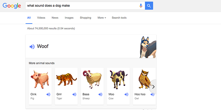 ۹- گوش دادن به صدای حیوانات در گوگل امکانپذیر است. بهعنوان مثال با جستوجوی عبارت "what sound does a dog make" میتوانید به صدای سگ گوش دهید و در صورتی که نام حیوان دیگری را در این عبارت قرار دهید، صدای آن حیوان برای شما پخش میشود. این قابلیت برای آموزش صدای حیوانات به کودکان مفید است.