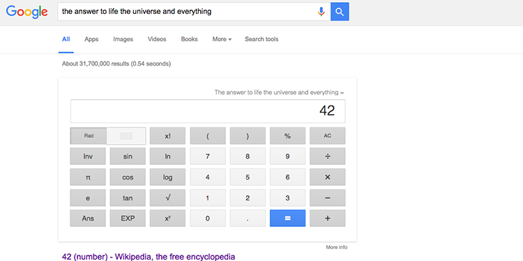 ۱۰- یکی از قابلیتهای عجیب گوگل با جستوجو در مورد پاسخ به سوالاتی در مورد حیات و جهان هستی نمایان میشود. عبارت "the answer to life, the universe, and everything" با عدد ۴۲ پاسخ داده میشود. این عدد اشارهای دارد به کتاب کمدی و علمی تخیلی The Hitchhiker’s Guide to the Galaxy نوشته داگلاس آدامز.