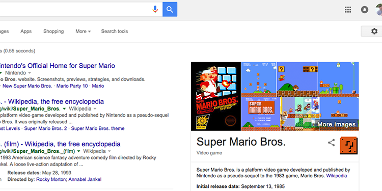 ۱۱- بهطور حتم در تیم طراحی گوگل افراد عاشق بازی نیز وجود دارند. با جستوجوی عبارت “Super Mario Bros”، درکنار نتایج جستوجو، بلوک آجری این بازی معروف با علامت سؤال نمایش داده میشود که کلیک روی آن، صدای مشهور سری بازیهای سوپر ماریو را با همان جلوه پخش میکند.