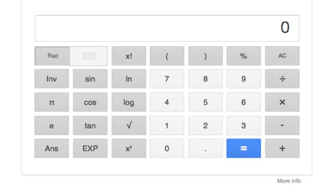 اگر در نوار جستوجوی گوگل "calculator" را تایپ کنید، ویجت ماشینحساب برای شما نمایان خواهد شد. این ماشینحساب برای محاسبات عادی کافی خواهد بود. همچنین میتوانید اعمال ریاضی خود را بهصورت سوالی از گوگل بپرسید؛ بهعنوان مثال عبارت "? how much is 14% of £327" به شما مقدار ۱۴ درصد از ۳۲۷ یورو را نمایش میدهد. علاوه بر محاسبات پایهای میتوانید معادلاتی از جمله معادلات مثلثاتی، نمایی و لگاریتمی را رسم کنید.
