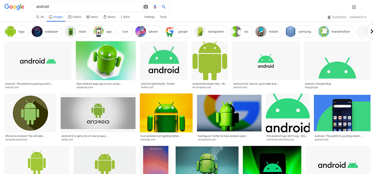 هرگاه در جستوجوی تصویری گوگل عبارتی را جستوجو میکنید و عبارت جستوجو دوپهلو باشد، نواری در بالای تصاویر یافتشده برای انتخاب نوع تصویر ظاهر میشود. برای مثال وقتی شما کلمه "Android" را در قسمت تصاویر جستوجو میکنید در قسمت بالایی تصاویر نواری ظاهر میشود که در آن تصاویر در گروههای مختلفی مانند"logo" و "wallpaper" و مواردی از این دست تقسیمبندی شدهاند. برای دسترسی به تنظیمات بیشتر میتوانید روی "Search tools" کلیک کنید. با نمایانشدن تنظیمات میتوان اقدام به پالایش تصاویر بر اساس اندازه، زمان ایجاد شدن و رنگ و موارد دیگر بکنید. برای جلوگیری از نمایش نتایج نامناسب برای برخی سنین، گزینه "SafeSearch" را فعال کنید.