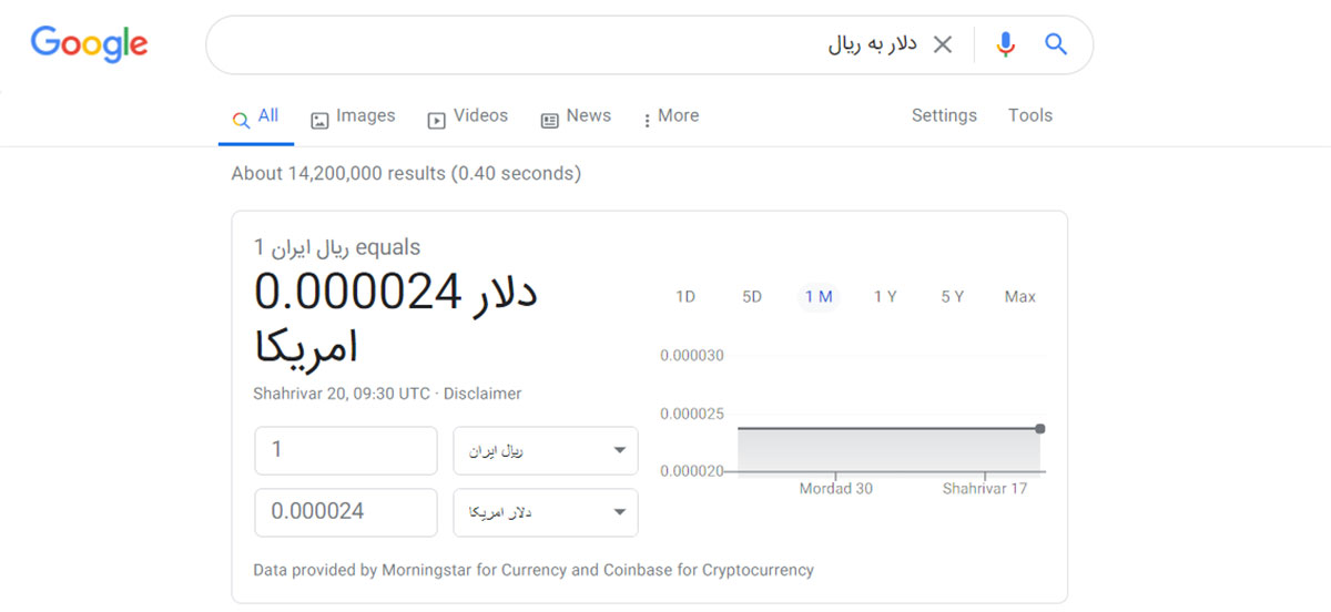 برای تبدیل قیمت ارز، وزن و واحدهای گوناگون میتوانید از نوار جستوجوی گوگل استفاده کنید. برای این کار تنها باید عبارت "convert" را قبل از واحدهای مدنظر اضافه کرده و بین دو واحد از "to" استفاده کنید. بهعنوان مثال قصد دارید ۳۲۰ درجه فارنهایت را به درجه سلسیوس تبدیل کنید. برای این کار در نوار جستوجوی گوگل عبارت "Convert 320 F to C" را جستوجو کنید. مبدل گوگل آشنایی کاملی با زوایا، نرخ جریان، فرکانسها، اسب بخار، حجم، وزن، طول، نرخ داده و ارزها دارد. همانطور که در تصویر میبینید، جستوجوی ارزها با تقریب مناسبی به فارسی هم بهخوبی عمل میکند.