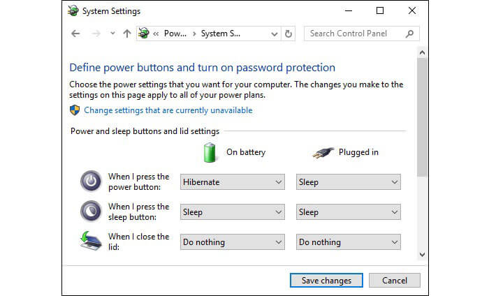 در پنجره System Settings، میتوانید گزینههای موردنظرتان را انتخاب کنید. همچنین امکان تغییر تنظیمات مطابق با زمانیکه دستگاه به برق متصل است یا خیر هم وجود دارد.