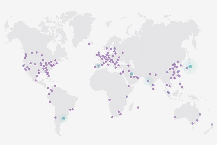 وقتی قصد راهاندازی یک وبسایت را دارید هاستی بر روی یک سرور تهیه میکنید و بدین ترتیب سایت شما فعالیت میکند؛ اما یک CDN به جای استفاده از تنها یک سرور، از شبکهای جهانی از سرورها استفاده میکند تا محتوای شما را ارائه دهد. برای درک بهتر به این مثال توجه کنید. تصویر زیر تمامی سرورهای شرکت Cloudflare را نشان میدهد. هر نقطه در این نقشه یک سرور است. وقتی محتوایی را در Cloudflare آپلود میکنید، این محتوا در تمامی سرورها کپی میشود و هنگام درخواست کاربر، سریعترین سرور محتوا را ارائه میدهد. سریعترین سرور معمولاً از لحاظ جغرافیایی نزدیکترین است اما همیشه اینطور نیست. پس اگر شما بخواهید از ایران محتوا دریافت کنید احتمالا از یکی از سرورهای نزدیک ایران آن را دریافت میکنید.