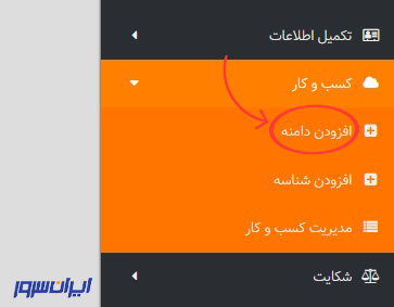 برای افزودن کسب و کار از منوی سمت راست پنل کاربری روی بخش افزودن دامنه کلیک کنید.