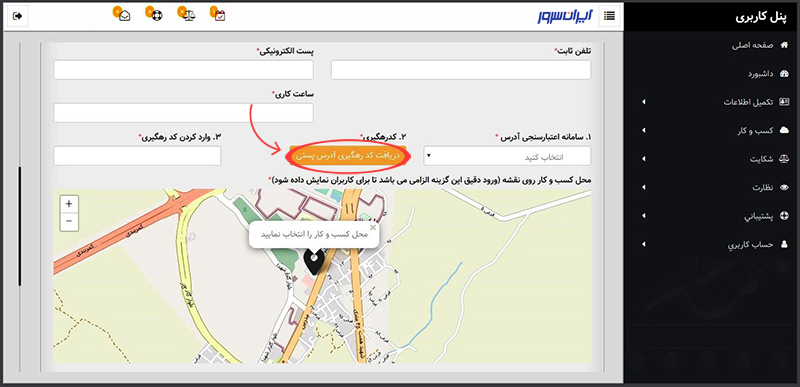 بعد از پر کردن فیلدهای مورد نظر روی دکمه نارنجی رنگ کلیک کنید. با کلیک روی این گزینه وارد صفحه اینترنتی پست میشوید. مراحل پرداخت مرسوله را مطابق با تعرفه انجام دهید تا برای تایید اطلاعات مکانی شما یک بسته ارسال شود. بعد از دریافت بسته مطابق راهنمای آن عمل کرده و کد رهگیری که برای شما ارسال شده را در کادر مربوط برای احراز درستی و صحت اطلاعات کسب و کار ثبت کنید.