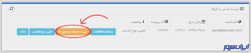 بعد از تکمیل این کار باید نوع خدمتی که در وبسایت خود ارائه می دهید را مشخص کنید. روی بخش نارنجی تصویر زیر که با عنوان لیست خدمات و مجوزها مشخص شده کلیک کنید.