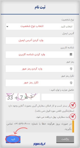 در مرحله بعد، اول نوع شخصیت را انتخاب کنید. حالا اگر شخص حقیقی را انتخاب کردهاید، اطلاعات شخصی خود از جمله نام و نام خانوادگی، کد ملی، شناسه کاربری و رمز عبور را وارد کنید. در نهایت تیک دو گزینه پایین را بزنید و بر روی دکمه تایید کلیک کنید.