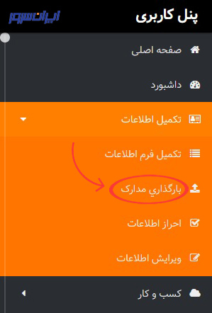 پس از تکمیل فرم اطلاعات هویتی به صفحه اصلی بازگردید و مجددا از منوی تکمیل اطلاعات این بار بارگذاری مدارک را انتخاب کنید.