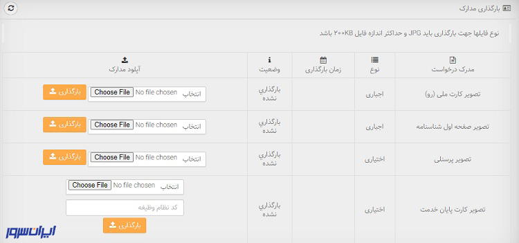 در این بخش باید تصویر اسکن شده مدارک مورد نیاز را طبق دستورالعمل (دارای پسوند jpg و حجم کمتر از ۲۰۰ کیلوبایت) بارگذاری کنید. گفتنیاست از بین مدارک خواسته شده، فقط تصویر کارت ملی و صفحه اول شناسنامه اجباری است و مابقی مدارک اختیاری هستند. توجه کنید تصاویر اسکن شده از کیفیت لازم برخوردار باشند تا در طول مسیر اجرایی به مشکلی برنخورید.