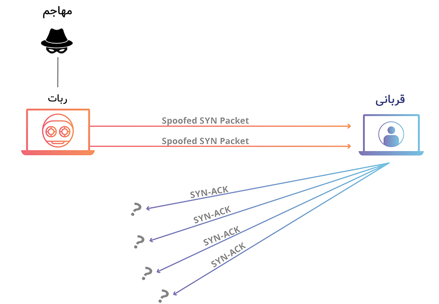 حملۀ SYN flood، یکی از نمونههای رایجِ حمله به لایه ۳ و ۴ است. اجازه دهید با یک مثال این حمله را توضیح دهیم.