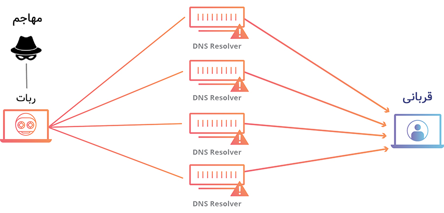 به وسیلۀ ارسال درخواست با یک آدرس IP تقلبی (آدرس آیپی واقعی هدف)، به یک سرور DNS باز، آدرس IP مقصد از سرور پاسخ دریافت میکند. در ضمن مهاجم درخواست را طوری طراحی کرده که سرور DNS با حجم بالایی از دادهها مجبور به پاسخگویی باشد. در نتیجه، هدف یک نسخه تقویتشده از درخواست اولیه مهاجم را دریافت میکند.