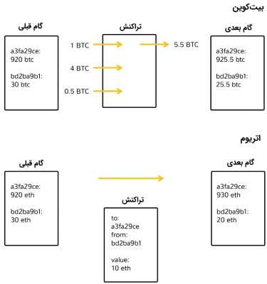 برخلاف بیتکوین، اتریوم با استفاده از حسابها و ترازها به روشی با عنوان «انتقال وضعیت» (State Transfer | انتقال حالت) کار میکند. این روش بر خروجی معامله ارسال نشده (Unspent Transaction Output | UTXo) تمرکز ندارد. وضعیت (حالت | State)، تراز فعلی همه حسابها و دادههای اضافی را نمایش میدهد. وضعیت در بلاکچین ذخیره نمیشود، بلکه در یک «درخت درهم پاتریشیا» (Merkle Patricia Tree) ذخیره میشود.