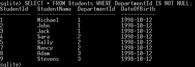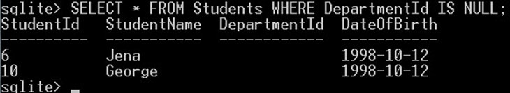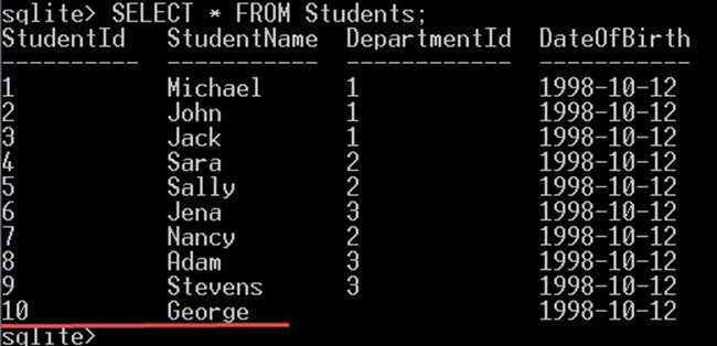 INSERT INTO Students VALUES(6, 'Jena', NULL, '1998-10-12');