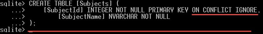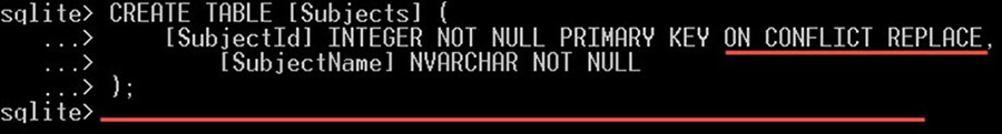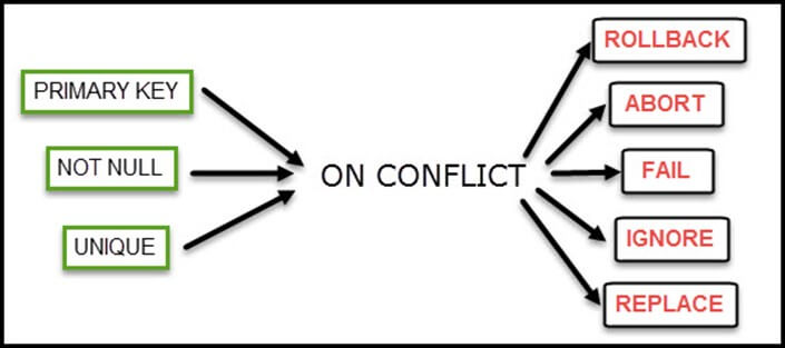 - با استفاده از گزاره INSERT ON CONFLICT REPLACE میتوان به SQLite اعلام کرد که باید یک درج روی جدول انجام دهد و اگر ردیفهایی با کلیدهای اصلی یکسان بیابد، در این صورت باید آن مقادیر را با مقادیر درج شده بهروزرسانی کند.